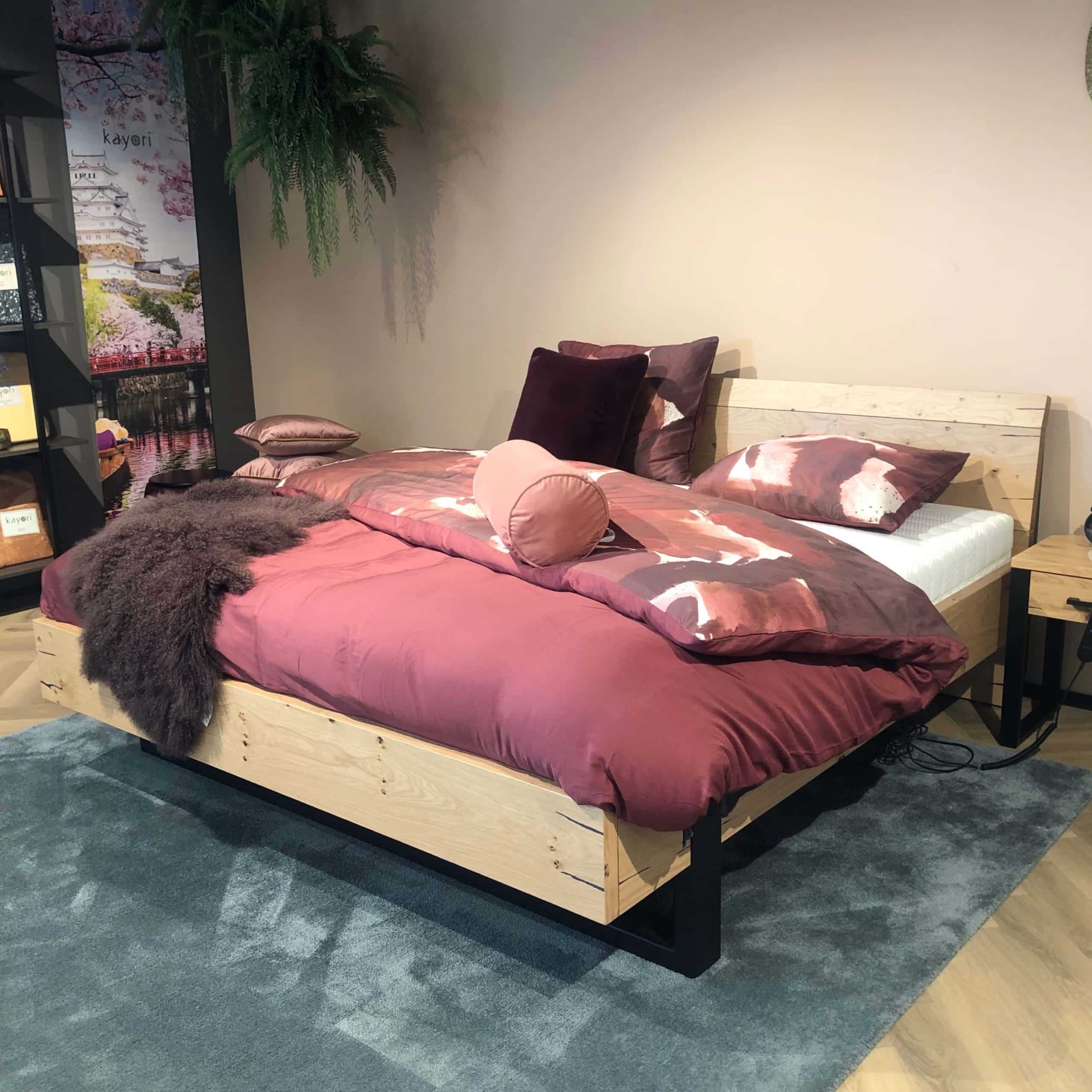 Rough is een houten bed met een natuurlijke en stoere uitstraling. Het bed wordt gedragen door een zwart onderstel en is tegen een meerprijs verkrijgbaar met bijpassende nachtkastjes. Dit stevige bed kan gecombineerd worden met een matras naar keuze voor een persoonlijk comfort. Dit kan een matras zijn van het huidige bed of een matras van onze slaapafdeling.