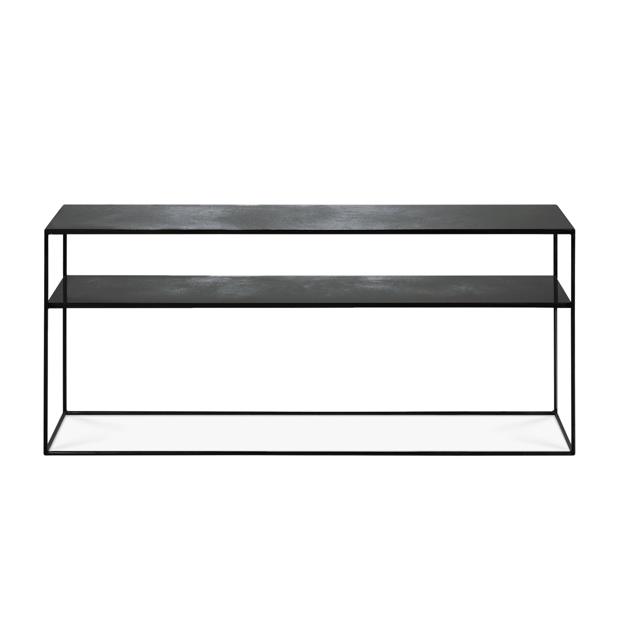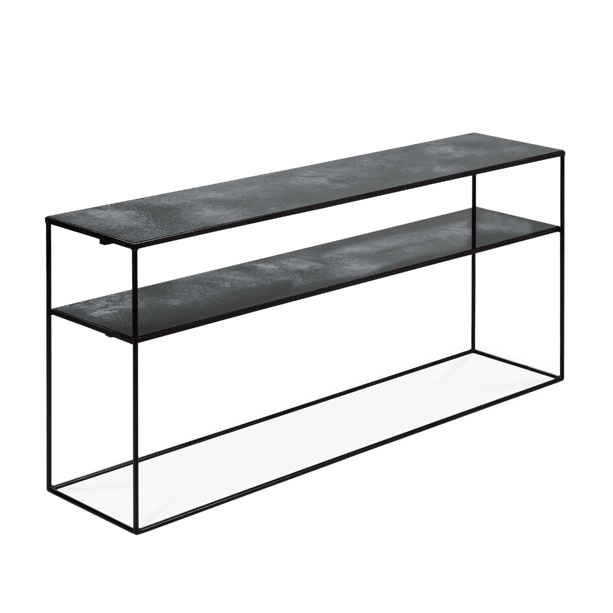 Ben je op zoek naar een meubel waarop je jouw accessoires kunt plaatsen? Met sidetable Charocal console kun je alle kanten op. De sidetable heeft een ranke vorm en past perfect achter of naast jouw bank. Het zwart metalen frame wordt gecombineerd met verouderde, spiegelglazen bladen.