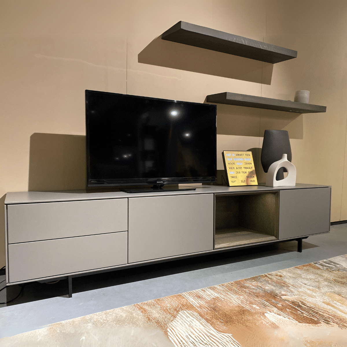 Tv-meubel NYRO van het Belgische merk Saunaco is een design kast met een prachtige kwaliteit. Deze maatwerk kast stel je volledig naar eigen wens samen. De prijs is afhankelijk van de afmeting en afwerking die je kiest. De getoonde prijs is van het tv-meubel zoals getoond in onze showroom (zie eerste foto). Onderstaand vertellen onze adviseurs je alvast meer over het product.
